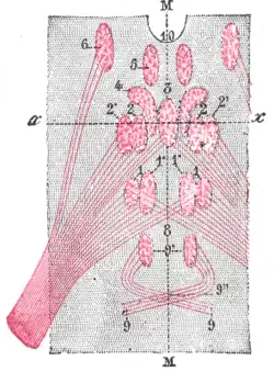 Outrossim, o núcleo de Edinger-Westphal é um termo com frequência utilizado para referir-se à população adjacente de neurônios não pré-ganglionares que não se projetam para o gânglio ciliar ou oftálmico, mas sim na medula espinal, núcleo dorsal da rafe, e nos laterais núcleos septais.[1]