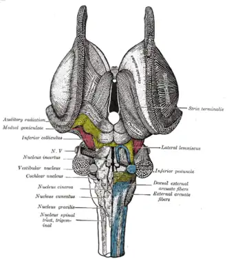 ![]() Dissecção do tronco encefálico. Visão dorsal. O núcleo vestibular é indicado à esquerda.