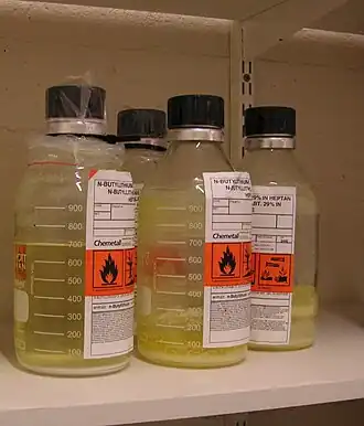 Compostos de alquil-lítio são armazenados em gás inerte para prevenir perda de atividade e por razões de segurança. N-BuLi reage violentamente com a água: