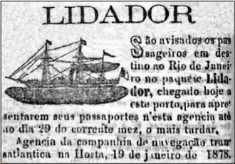 Ao final de janeiro de 1878 o "Lidador", sob o comando do capitão da marinha mercante Augusto Borges Cabral, natural da ilha de Santa Maria, aportou à Horta, na ilha do Faial, onde embarcou emigrantes e passageiros faialenses com destino ao Brasil, e prosseguiu viagem rumo à ilha Terceira, na que seria a sua última escala.