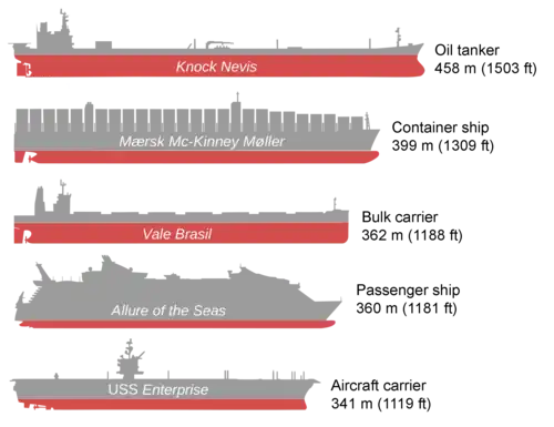 • Knock Nevis, construído em 1976 com 458 metros de comprimento e capacidade para 564 mil toneladas de crude. Foi desmantelado por uma empresa indiana em 2010 para sucata. Foi o maior objeto que pode se locomover construído pelo homem.[7][8]