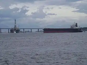 Petroleiro ao lado de uma plataforma petrolífera na baía de Guanabara, Rio de Janeiro.