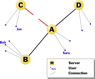 Quando a conexão entre A e C é interrompida, os usuários que estavam conectados a outros servidores que não são mais acessíveis na rede parecem encerrar. Por exemplo, se o usuário Sara está conectado ao servidor A, o usuário Bob está conectado ao servidor B e o usuário Joe está conectado ao C, e C divide, ou desconecta, de A, para Joe parecerá como se Sara e Bob tivessem encerrado (desconectado da rede), e parecerá para Sara e Bob que Joe desistiu. No entanto, Joe ainda pode falar com qualquer pessoa que esteja conectada ao mesmo servidor (neste caso, servidor C). Isso ocorre porque os servidores aos quais estão conectados são informados da alteração do status da rede e atualizam suas informações locais de acordo para exibir a alteração.