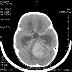 A tomografia computadorizada do cérebro normalmente mostra uma massa de tecido que pode ser realçada por qualquer contraste. Na TC, os gliomas de baixo grau geralmente parecem isodensos ao parênquima normal e, portanto, podem não apresentar realce pelo contraste. Da mesma forma, lesões na fossa posterior do crânio são difíceis de identificar na TC. Consequentemente, os resultados dessa tomografia isoladamente nem sempre são suficientes para fins diagnósticos. Em casos duvidosos, o uso da ressonância magnética mais sensível é essencial.