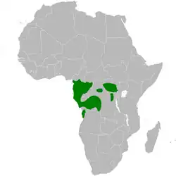 Pode ser encontrada nos seguintes países: Angola, Camarões, República Centro-Africana, República do Congo, República Democrática do Congo, Guiné Equatorial, Gabão e Uganda.[1]