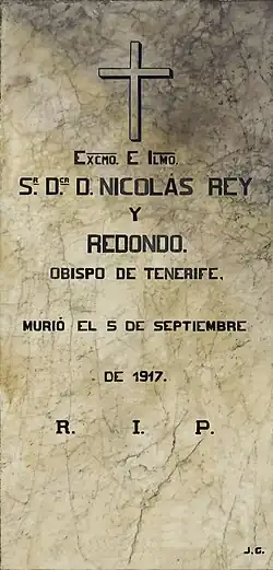 Bispo Nicolás Rey y Redondo morreu em San Cristóbal de La Laguna em 5 de setembro de 1917 e foi enterrado na capela da Imaculada Conceição da Catedral de La Laguna.[1]