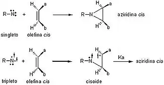 O mecanismo de adição de nitrenos a olefinas foi sugerido por Skell e Woodworth em 1956 e 1959.[18][19] A hipótese por eles desenvolvida pode ser resumida da seguinte forma: (a) as espécies singleto podem reagir em uma única etapa gerando um anel de três membros (aziridina) de forma estéreo-específica, enquanto que, (b) as espécies tripleto necessariamente formam um intermediário dirradical, o qual possui barreiras energéticas de rotação menores sobre uma única ligação (Figura 5).[20]
