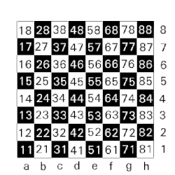 Tabuleiro demonstrando os sistemas de notação postal e algébrica comparados.