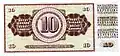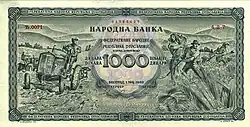 | 1 dinar | 90 x 50 | Marrom acinzentado | Partisan com uma arma | Brasão, indicação de valor | 1944 | 20 de abril de 1945 | 1 de julho de 1956 | |