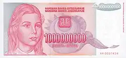1,000,000,000 dinara | 179½ × 82½ | Rosa e azul claro | Uma garota | Edifício do Parlamento Federal | 30 de agosto de 1993 | |||