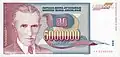 5,000,000 dinara | 163 × 78 | Verde e vermelho escuro | Nikola Tesla | Bobina de Tesla e Usina Hidrelétrica Porta de Ferro II | 26 de maio de 1993 | 1 de dezembro de 1993 | ||