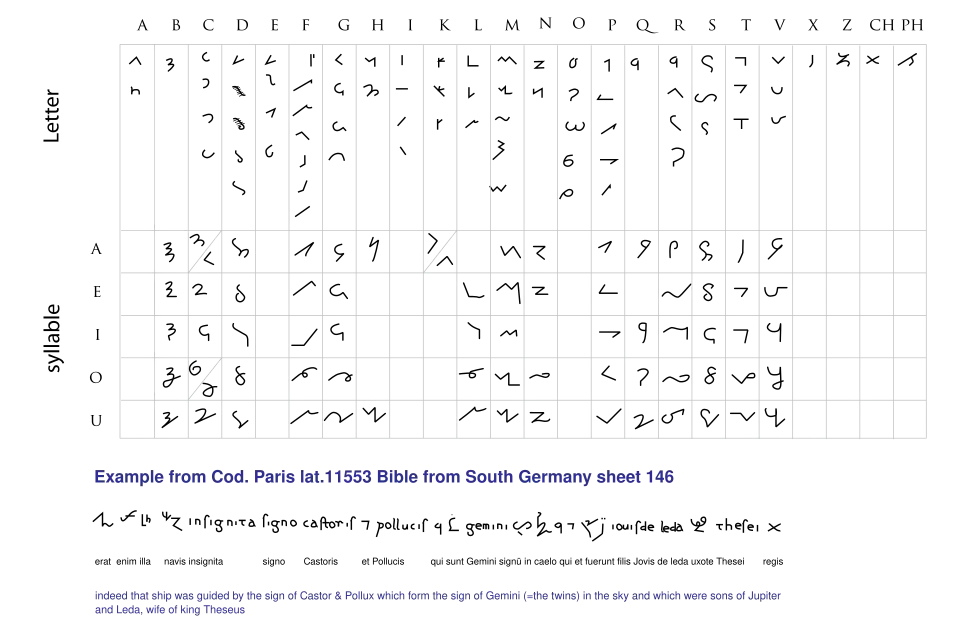 - ↑ Guénin, Louis-Prosper; Guénin, Eugène (1908). Histoire de la sténographie dans l'antiquité et au moyen-âge; les notes tironiennes (em francês). Paris: Hachette et cie. OCLC 301255530