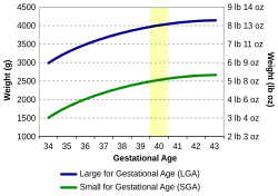 Pesquisas mostram que quando os pesos ao nascer de bebês são maiores que o percentil 90 do gráfico de crescimento para bebês da mesma idade gestacional, eles são considerados grande para a idade gestacional ou GIG.[30] Isso é conhecido como macrossomia, indicando que o bebê pesa mais do que 90% dos outros na mesma idade gestacional.[30]