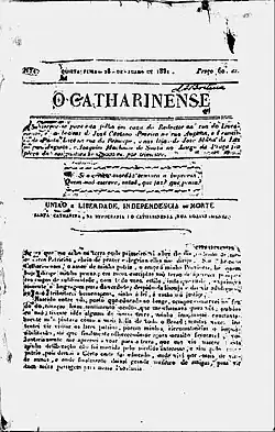 Em 27 de julho de 1831, letras de chumbo 'entalharam' numa folha de 19 cm x 25 cm, as notícias do primeiro número do jornal. Na manhã de 28 de julho, circulou o número 01 do jornal "O Catharinense", porém o jornal não teve tanta importância na época, e logo o conselheiro Jerônimo Coelho, fechou o jornal e a oficina tipográfica.[1] [2] [3]