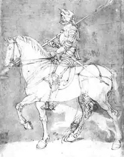 No entanto, os cavaleiros eram vulgarmente representados na arte contemporânea de Dürer com uma cauda de raposa amarrada à ponta da lança, sendo a cauda de raposa um amuleto de proteção vulgar.[17]