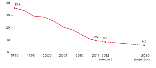 Desde 1990, países em todo o mundo tomaram várias medidas para reduzir a pobreza e alcançaram resultados notáveis. O número de pessoas que vivem em extrema pobreza diminuiu de 1,8 mil milhões para 776 milhões em 2013.[11][12] Ainda assim, muitas pessoas continuam a viver na pobreza, com o Banco Mundial estimando que 40 milhões a 60 milhões de pessoas cairão na pobreza extrema em 2020.[13] Um limiar de pobreza muito baixo justifica-se ao realçar a necessidade das pessoas que se encontram na posição menos favorável. Essa meta pode não ser adequada para a subsistência humana e as necessidades básicas; sendo por essa razão que também são normalmente rastreadas mudanças relativas a linhas de pobreza mais altas.