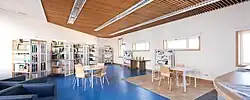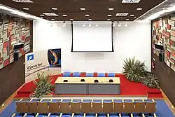 Por fim, o auditório de 150 lugares com paredes revestidas de aglomerado negro e frescos em tons a fazer lembrar o montado. O auditório é um espaço convidativo para a realização de conferências, seminários, encontros temáticos, entre outros.