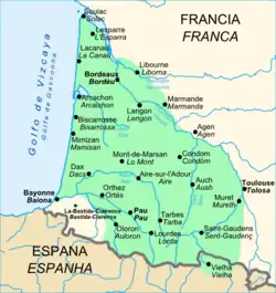 As variedades regionais são o bearnês, o parlar negre das Landes e os dialetos de Bazadais, Albret, Lomagne, Cominges, Couserans, Vale de Aran (já em Espanha) e Armagnac.