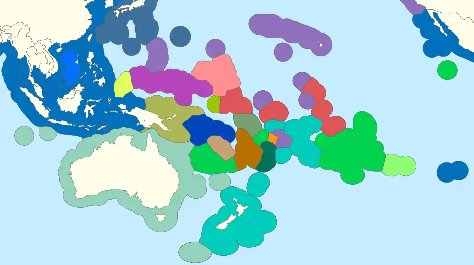 - Polinésia ("muitas ilhas"): corresponde às ilhas mais distantes da Austrália, dispersas por uma grande área do Pacífico. São em sua maioria possessões britânicas, francesas e Chilena. Os países independentes da Polinésia são Tonga, Samoa, Tuvalu e, historicamente e culturalmente (o último em relação aos seus povos aborígenes), a Nova Zelândia (nome polinésio: Aotearoa). O estado estadunidense do Havaí e a ilha chilena Rapa Nui ou ilha de Páscoa também fazem parte da Polinésia.[23]