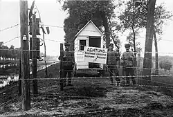 Desde o momento da invasão, um número significativo de homens belgas tentou fugir dos territórios ocupados para se juntar ao exército belga na frente de Yser, através dos Países Baixos, que eram neutros. [22] Para impedir isso, os alemães começaram a trabalhar em um arame farpado e uma cerca elétrica ao longo da fronteira. A cerca, apelidada de Fio da Morte (Dodendraad), também era guardada por sentinelas alemãs. [48] Acredita-se que entre 2.000 e 3.000 civis foram mortos tentando cruzar a fronteira durante o conflito.
