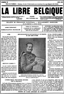 Além disso, jornais clandestinos também tiveram um papel importante na atividade de resistência. Os jornais forneciam informações censuradas na imprensa aprovada e também propaganda patriótica. [51] Alguns jornais clandestinos, nomeadamente La Libre Belgique (A Bélgica Livre) e De Vlaamsche Leeuw (O Leão Flamengo), conseguiam atingir um grande número de pessoas. [26] Os jornais underground foram produzidos em vários formatos e áreas geográficas, às vezes visando grupos demográficos específicos. [17] No seu auge, La Libre Belgique teve 600 colaboradores individuais. [50]