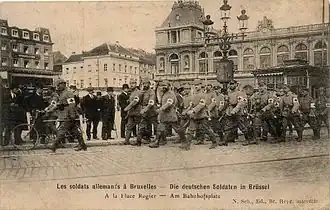 Após um motim em Kiel no final de outubro, uma onda de revoluções eclodiu dentro do exército alemão. Na Bélgica ocupada, soldados da guarnição de Bruxelas se amotinaram contra seus oficiais em 9 de novembro de 1918. Os revolucionários formaram o Conselho dos Soldados de Bruxelas (Soldatenrat) e hastearam a bandeira vermelha na Kommandantur de Bruxelas enquanto muitos oficiais, incluindo o Governador-Geral, deixaram a cidade para a Alemanha. Logo eclodiram combates nas ruas entre os legalistas e os revolucionários alemães. [54] Com a polícia alemã deixando de manter a ordem, a anarquia eclodiu na cidade, sendo restaurada apenas com a chegada das tropas belgas. [54]