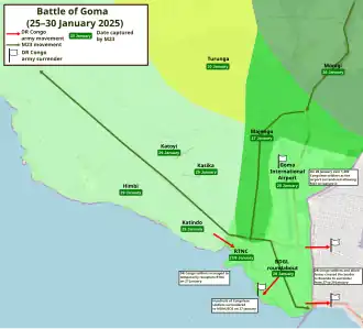 Após a captura do Aeroporto Internacional de Goma pelo M23, os combates continuaram em outras partes da cidade, com as tropas restantes das FARDC e milicianos Wazalendo.[56][57] As baixas civis foram relatadas em mais de 100 mortos e 1.000 feridos.[58] Naquela noite, Tshisekedi nomeou o Brigadeiro-General Evariste Somo como governador militar de Quivu do Norte e o promoveu ao posto de major-general, sucedendo Peter Cirimwami, que havia sido morto vários dias antes.[59][60]