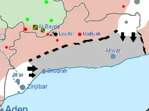 ![]() O território que a AQAP apreendeu durante a ofensiva mostrado em cinza escuro, cercado por linhas pretas. | |||