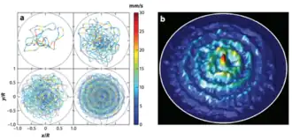 (a) Um caminhante em um curral circular. Trajetórias de comprimento crescente são codificadas por cores de acordo com a velocidade local da gotícula (b) A distribuição de probabilidade da posição da gota ambulante corresponde aproximadamente à amplitude do modo de onda Faraday do curral.