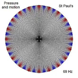 Rayleigh desenvolveu teorias de ondas para a Catedral em 1910[6] e 1914[7]. Confinar ondas sonoras dentro de uma cavidade envolve a física de ressonância baseada em interferência de ondas; o som só pode existir em certas alturas, como no caso de órgãos de tubo. O som forma padrões sonoros chamados modos, como mostrado no diagrama.[1]
