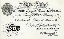Ao ver a qualidade das notas, um funcionário do banco descreveu-as como “as mais perigosas alguma vez vistas”;[96] a marca de água era a fonte mais fiável para detectar as falsificações.[97] Notas falsas no valor de £ 15–20 milhões estavam em circulação geral no final da guerra.[14] Com tal volume em circulação geral, em abril de 1943 o Banco da Inglaterra deixou de emitir todas as notas de £ 10 e acima.[65] Em Fevereiro de 1957, foi emitida uma nova nota de £ 5; a nota azul foi impressa em ambos os lados e "contava com sutis mudanças de cor e gravação detalhada à máquina" para segurança.[98] Outras denominações também foram reintroduzidas: a nota de £ 10 em fevereiro de 1964, a nota de £ 20 em julho de 1970 e a nota de £ 50 em março de 1981.[99]