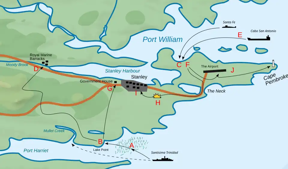 Na noite de 1–2 de abril de 1982, o Santísima Trinidad parou a cerca de 500 metres (1.600 ft) de Mullet Creek e baixou 21 botes infláveis de assalto, contendo 84 militares de forças especiais[22] do 1º Grupo de Comandos Anfíbios do capitão-tenente Guillermo Sánchez-Sabarots e um pequeno grupo[23] sob o comando do capitão-tenente Pedro Giachino, que era subcomandante do 1º Batalhão de Infantaria de Marinha e havia se oferecido para a missão[24] de capturar a Casa do Governo.[25] O contra-almirante argentino Jorge Allara, por mensagem de rádio a partir do Santisima Trinidad, solicitara a Rex Hunt uma rendição pacífica, mas o pedido foi rejeitado.[25]