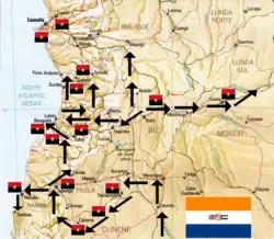 ![]() Avanço das tropas sul-africanas e da UNITA durante as batalhas da Operação Savana. | |||