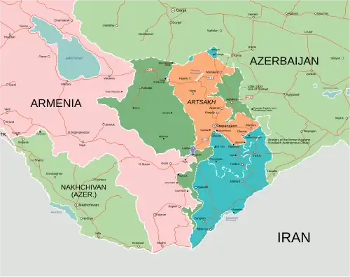 - ↑ «Azerbaijani troops enter Lachin district in Nagorno-Karabakh». TASS. 30 de novembro de 2020. Cópia arquivada em 1 de dezembro de 2020