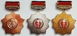 - ↑ Decreto sobre o uso das insígnias de condecorações estatais, de 19 de abril de 1978, Impressão especial nº 952 do Gesetzblatt da RDA (citado em: Günter Tautz, Ordens e Medalhas. Condecorações estatais da República Democrática Alemã, 2ª ed., VEB Bibliographisches Institut, Leipzig 1983, p. 188)