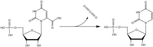 - ↑ Beak P, Siegel B (1976). «Mechanism of decarboxylation of 1,3-dimethylorotic acid. A model for orotidine 5'-phosphate decarboxylase». J Am Chem Soc. 98 (12): 3601–6. PMID 1270703. doi:10.1021/ja00428a035
