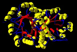 - ↑ PDB 1EIX; Harris P, Navarro Poulsen JC, Jensen KF, Larsen S (Abril 2000). «Structural basis for the catalytic mechanism of a proficient enzyme: orotidine 5'-monophosphate decarboxylase». Biochemistry. 39 (15): 4217–24. PMID 10757968. doi:10.1021/bi992952r