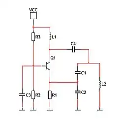 Neste exemplo, o transistor está na configuração de emissor comum, mas podemos modificar a configuração conforme a faixa de frequências geradas.[2]