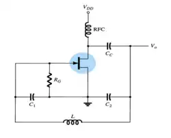 A diferença deste oscilador em relação ao anterior é a alta impedância do gate (comporta) que não sobrecarrega a bobina. Além disso, o FET amplifica frequências altas com ganho superior ao dos transistores bipolares. Sua frequência de ressonância pode ser calculada da mesma maneira do Colpitts usando transistor bipolar.[1][2]