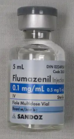 O flumazenil (Romazicon) é um antagonista do receptor de benzodiazepina que pode ser usado como antídoto para a overdose de benzodiazepínicos. Seu uso, no entanto, é controverso, pois possui inúmeras contra-indicações.[1][38] É contraindicado em pacientes em uso de benzodiazepínicos a longo prazo, em pacientes que ingeriram alguma substância que reduz o limiar convulsivo ou em pacientes com taquicardia, complexo QRS aumentado no eletrocardiograma, sinais anticolinérgicos ou histórico de convulsões.[39] Devido a essas contra-indicações e à possibilidade de causar efeitos adversos graves, incluindo convulsões, efeitos cardíacos adversos e até mesmo a morte,[40][41] na maioria dos casos, não há indicação para o uso de flumazenil no controle da overdose de benzodiazepina, pois os riscos em geral superam qualquer benefício potencial da administração.[36] Também não tem papel no gerenciamento de overdoses desconhecidas.[7] Além disso, se a recuperação total das vias aéreas for alcançada, é esperado um bom resultado e, portanto, é improvável que seja necessária a administração de flumazenil.[42]