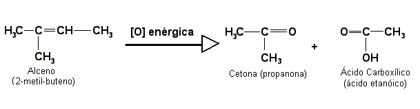 Na quebra oxidativa, ou oxidação enérgica, o agente oxidante "quebra" a molécula na dupla ligação e caso se forme um aldeído ele é oxidado a ácido carboxílico. O agente oxidante mais comuns nesse caso é o permanganato de potássio (KMnO4) a quente em meio básico (SOLOMONS, 2012).