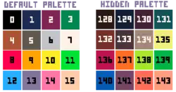 A paleta de PICO-8 contém 16 cores. As cores dela podem ser substituídas por um conjunto diferente de cores ao inserir um index de atualização de paleta com um ID de cor maior que 128. Essas cores não são oficialmente reconhecidas pelos criadores, porém são utilizadas pela comunidade e têm nomes não oficiais.[10]