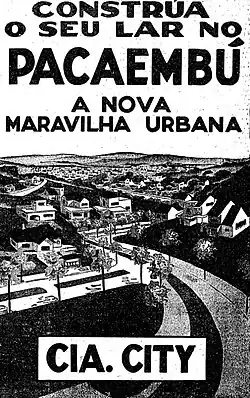 O bairro do Pacaembu assenta-se sobre o Vale do Ribeirão Pacaembu entre as altas encostas onde se localizam, atualmente, os bairros de Higienópolis e Perdizes.[13] A sua implantação se deu a partir de 1925, quando a Companhia City começou a urbanizar 998.130 m², fazendo o arruamento, traçando os lotes e colocando-os à venda. Em 1941, a City adquiriu mais 400.000 m² da Irmandade da Santa Casa de Misericórdia de São Paulo. A primeira medida foi drenar os terrenos inundáveis e canalizar o ribeirão onde está assentada a larga e arborizada Avenida Pacaembu.[13] Foram executados também trabalhos de terraplenagem com cortes e aterros para amenizar a declividade das encostas do vale. O adensamento no bairro aconteceu por volta de 1930, depois da construção do Estádio do Pacaembu pela prefeitura.[13]