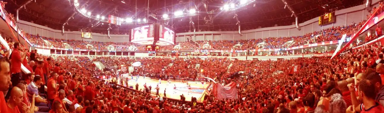 Foto panorâmica da parte inferior da Lottery Arena em Jerusalém durante um jogo de desempate entre o Hapoel Jerusalém e o Maccabi Rishon Lezion. Oferecendo Vista 7
