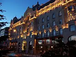 Originalmente, o palácio serviu como edifício de escritórios, assim como residência para ricos aristocratas britânicos ligados à Companhia Gresham. Durante a Segunda Guerra Mundial, os soldados soviéticos instalaram residência aviadamente no extravagante palácio. Mais tarde, o edifício ficou em mau estado, tendo servido como edifício de apartamentos durante o governo comunista da Hungria. Quando a democracia foi restaurada, o governo nacional ofereceu o palácio à cidade de Budapeste. Em 2001 foi comprado pela rede Four Seasons, tendo aberto pouco depois como um luxuoso hotel. Entre os detalhes originais restaurados pela Quinlan Private incluem-se amplas escadarias, vitrais, mosaicos, trabalhos em ferro forjado e jardins de inverno suspensos.