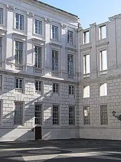 Fachada interior do Palácio. É visível o lado direito inacabado. Os últimos acabamentos, como os capitéis e janelas do último andar (falso) foram feitos só em meados do século XX.