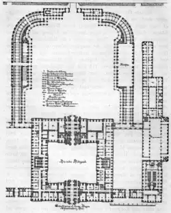 O edifício principal tinha 36 metros de altura, com um telhado revestido de cobre e uma torre com agulha de 84 metros de altura localizada acima da entrada principal, voltada para os jardins de exibição. A fachada era coberta por arenito e ricamente decorada com vasos, relevos, esculturas e detalhes ornamentais em cornijas e molduras de janelas.[2]