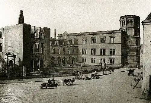 As suas ruínas foram demolidas, permanecendo apenas a torre com a forma deixada por Wiegmann. Apenas um contorno na praça, feito com diferentes pedras coloridas, indica o antigo esquema do Palácio de Düsseldorf. A Burgplatz nunca seria reconstruída, tal como desejaram os prussianos, os quais deram ordem para a demolição.