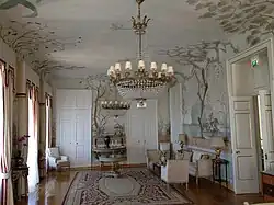 Realce ainda para a escadaria ampla, de dois braços e três lanços, dando acesso ao andar inferior. Refira-se que este é o Palácio de Seteais, descrito como abandonado na famosa obra de Eça de Queirós "Os Maias".
