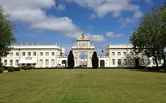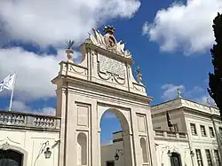 Em 1802 os dois corpos do palácio foram ligados por um imponente arco triunfal que o marquês de Marialva mandou levantar para comemorar a visita do rei D. João VI e da rainha D. Carlota Joaquina. Ao alto, sobre a inscrição comemorativa, o coroamento de lanças, bandeiras e armas emoldurando o medalhão com os bustos dos monarcas, é também característico do estilo neoclássico[6] e baseado nos desenhos de amortis sements do Cours d'Architecture. Francisco Leal Garcia recebeu a 21 de Maio de 1802 "quatrocentos e oitenta mil reis em moeda metal" para realizar o arco triunfal e o medalhão central ficou a cargo de Joaquim Timotheo da Costa, mestre latoeiro, no mesmo ano.[3]